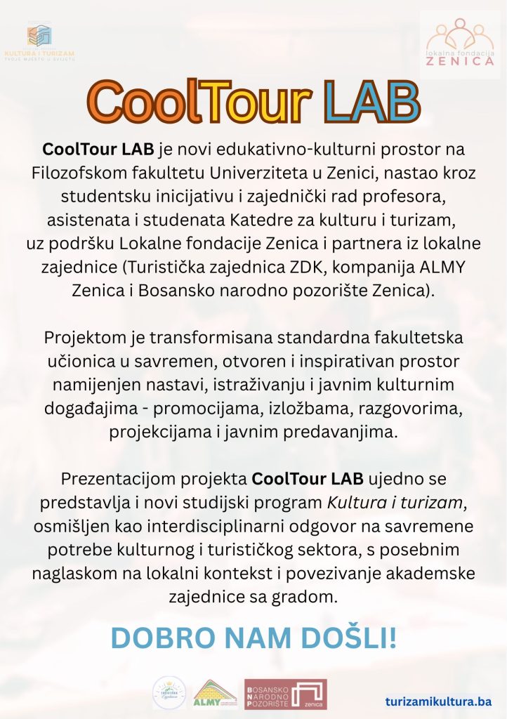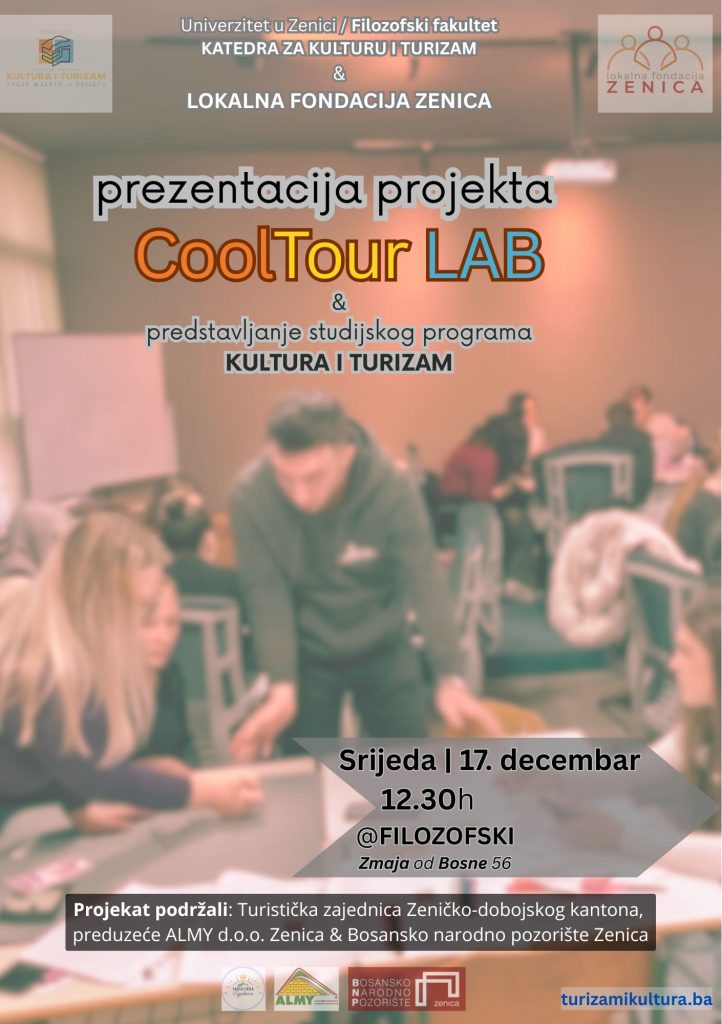 Katedra za kulturu i turizam Filozofskog fakulteta Univerziteta u Zenici, u srijedu 17.12.2025. predstavit će projekat CoolTour LAB – novi edukativno-kulturni prostor nastao kroz studentsku inicijativu i zajednički rad profesora, asistenata i studenata Katedre za kulturu i turizam.